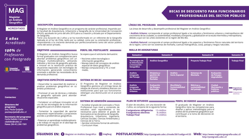 El área de especialización es el Análisis Geográfico como pensamiento o mirada espacial de la realidad aplicado en distintas ámbitos y escalas tales como fenómenos urbano-sociales del crecimiento de las ciudades, su sostenibilidad, movilidad, transporte y globalización en las distintas escalas espaciales y fenómenos físico-naturales del territorio tales como sistemas de montaña, cuencas hidrográficas, paisajes y riesgos socio-naturales desde la perspectiva del análisis geográfico.